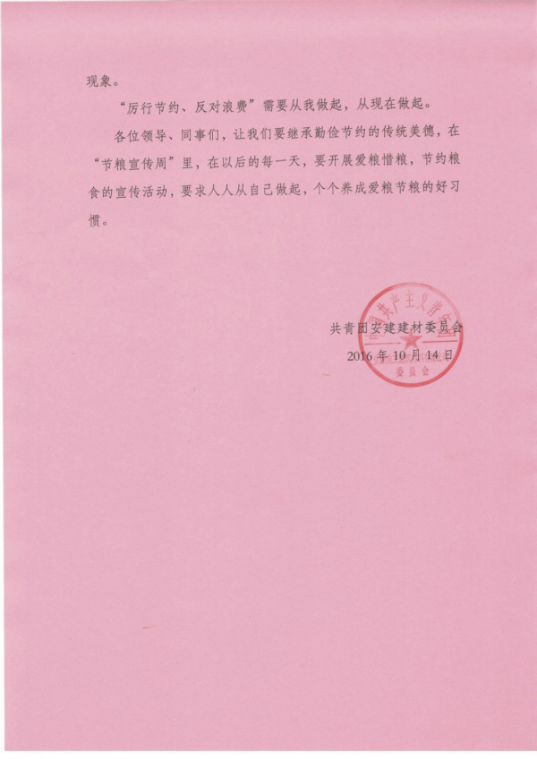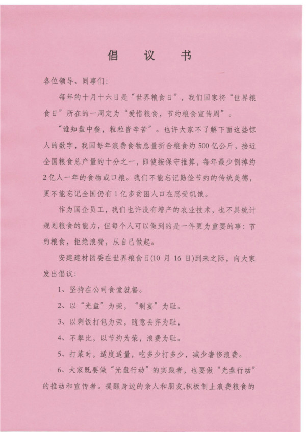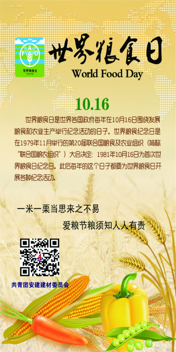 每年的10月16日是世界糧食日,每年世界糧食日所在周為全國愛惜糧食節(jié)約糧食宣傳周。安建建材團(tuán)委通過張貼節(jié)糧倡議書、發(fā)放愛糧節(jié)糧宣傳卡片、征集愛糧節(jié)糧宣言等方式廣泛引導(dǎo)、帶動(dòng)全體員工積極參與,大力宣傳愛糧節(jié)糧科學(xué)知識,號召大家養(yǎng)成居安思危、處豐思歉、惜糧如金、節(jié)糧成習(xí)的良好風(fēng)尚,從我做起、從身邊做起,減少糧食的損失與浪費(fèi)。