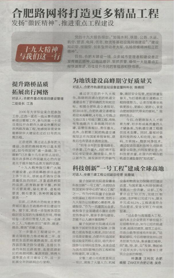 11月15日,合肥晚報(bào)A2版——“十九大精神在江淮”專版以《科技創(chuàng)新“一號(hào)工程”建成全球高地》為題,對(duì)話我公司黨委委員、副總經(jīng)理陸勤斌,暢談學(xué)習(xí)十九大精神的感受,引起了建筑行業(yè)的廣泛共鳴。
