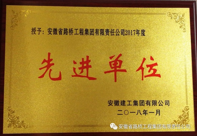 1月31日,在集團公司一屆四次職代會暨2018年工作會上,安徽路橋集團被授予集團公司2017年度先進單位榮譽稱號,這是公司連續(xù)兩年獲此榮譽。