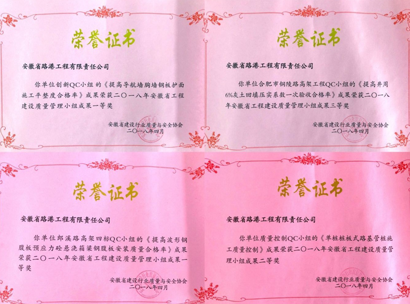 安徽路港郎溪路高架四標QC小組的《提高波形鋼腹板預應力砼懸澆箱梁鋼腹板安裝質量合格率》和南坪船閘創(chuàng)新QC小組的《提高導航墻胸墻鋼板護面施工平整度合格率》成果榮獲一等獎;合安高速改擴建02標項目質量控制QC小組的《單樁樁板式路基管樁施工質量控制》成果榮獲二等獎;合肥市銅陵路高架工程QC小組的《提高井周6%灰土回填壓實系數一次驗收合格率》成果榮獲三等獎。