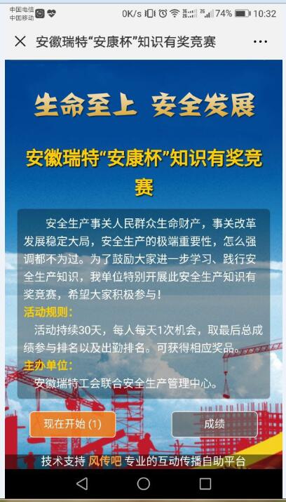 截止到6月18日,安徽瑞特工會聯(lián)合安全生產(chǎn)管理中心組織開展了為期一個(gè)月的“安康杯”安全知識微信線上答題活動。此次微信答題以及知識競賽活動內(nèi)容涵蓋安全生產(chǎn)有關(guān)法律法規(guī)、應(yīng)急救援、職業(yè)安全健康管理、工傷預(yù)防等多個(gè)方面,在工會的大力宣傳下,廣大職工積極參與。