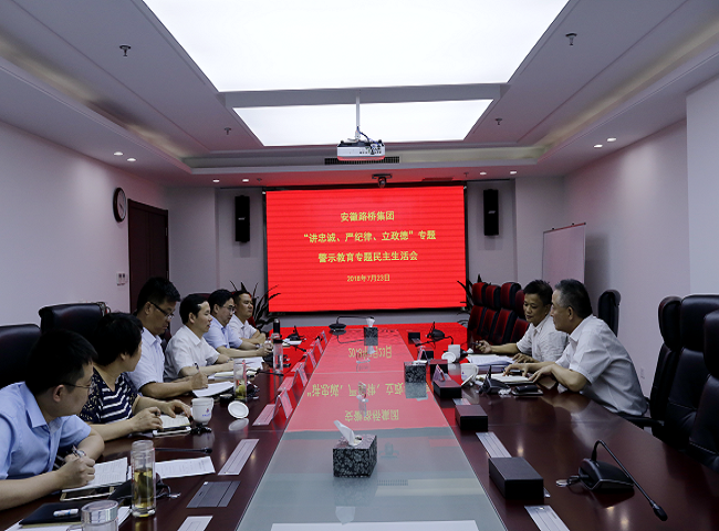 按照集團黨委《安徽建工集團黨委關(guān)于以魯煒案徽商集團窩案等案件為反面教材開展“講忠誠、嚴紀律、立政德”專題警示教育的安排意見》部署要求,安徽路橋集團于7月23日下午召開公司領(lǐng)導(dǎo)班子“講忠誠、嚴紀律、立政德”專題警示教育專題民主生活會,黨委書記、董事長、總經(jīng)理盛明宏主持會議,公司領(lǐng)導(dǎo)班子成員參加會議,集團黨委委員、紀委書記宋志華,紀委副書記、監(jiān)察室主任龔志酬到會指導(dǎo)。
