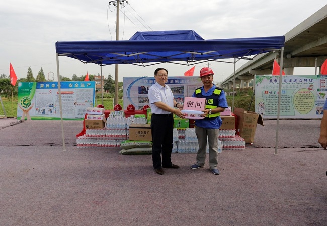 錢總一行來到項部施工現(xiàn)場看望和慰問奮戰(zhàn)在施工一線干部職工,為廣大職工送去藥品、飲料等防暑降溫物品。錢總對安徽路橋集團(tuán)廣大職工戰(zhàn)高溫、斗酷暑,堅持在一線施工的艱苦奮斗精神給予高度贊揚(yáng),對項目部現(xiàn)階段工作給予了肯定,要求項目部要進(jìn)一步加強(qiáng)管理,做好夏季施工防暑降溫工作,優(yōu)質(zhì)高效推進(jìn)工程建設(shè)。