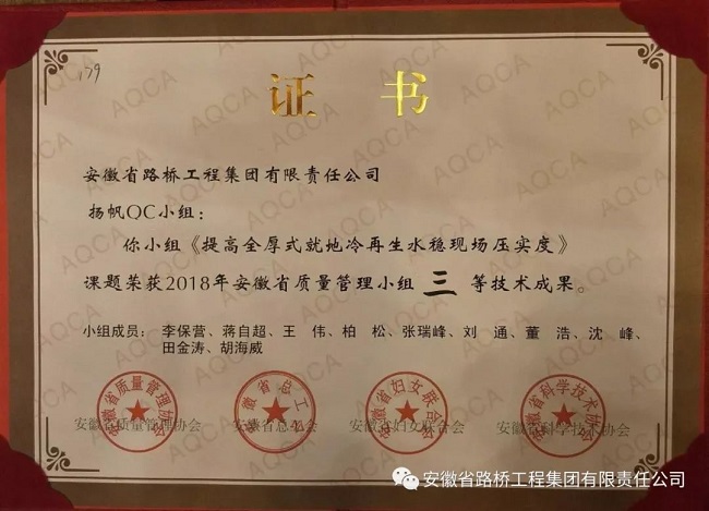 7月22日—7月25日,由安徽省質(zhì)量管理協(xié)會、安徽省總工會、安徽省婦女聯(lián)合會、安徽省科學(xué)技術(shù)協(xié)會主辦的2018年度安徽省質(zhì)量管理小組成果展示交流會在安徽黃山召開,全省各地市、各行業(yè)共355個優(yōu)秀成果參加此次發(fā)布會,此次大會的參賽小組數(shù)、發(fā)布成果數(shù)均為歷年之最。由公司選送的揚帆QC小組《提高全厚式就地冷再生水穩(wěn)現(xiàn)場施工現(xiàn)場壓實度》課題榮獲2018年安徽省質(zhì)量管理小組三等技術(shù)成果。