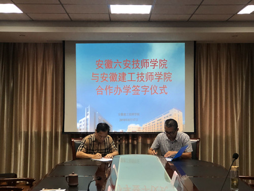2018年8月17日上午,安徽建工技師學(xué)院與六安技師學(xué)院成教聯(lián)合辦學(xué)協(xié)議簽字儀式在安徽建工技師學(xué)院行政樓三樓會議室舉行。六安技師學(xué)院副院長姚運林、教務(wù)處長李珍紅、成教辦主任任海鑫,安徽建工技師學(xué)院副院長任建設(shè)、招生就業(yè)處處長吳成群等共同出席簽約儀式。簽約儀式由任建設(shè)主持。