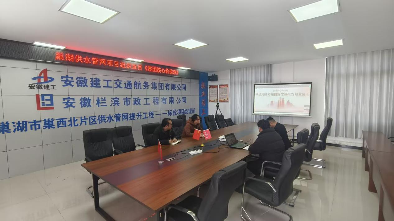 巢湖供水管道網項目召開專題會議,集中學習了集團發(fā)布的《關于開展安徽建工集團核心價值觀學習宣貫的通知》,鮮明解讀了“誠信共贏 卓越創(chuàng)新 忠誠擔當 敬業(yè)清正”核心要義。